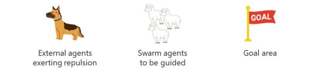 In contrast, the control agents (shepherds) know the target position and exert repulsive influences on the swarm through their movement. The shepherds cannot control individual swarm agents directly and are constrained to act on the swarm only indirectly through their own position and motion.